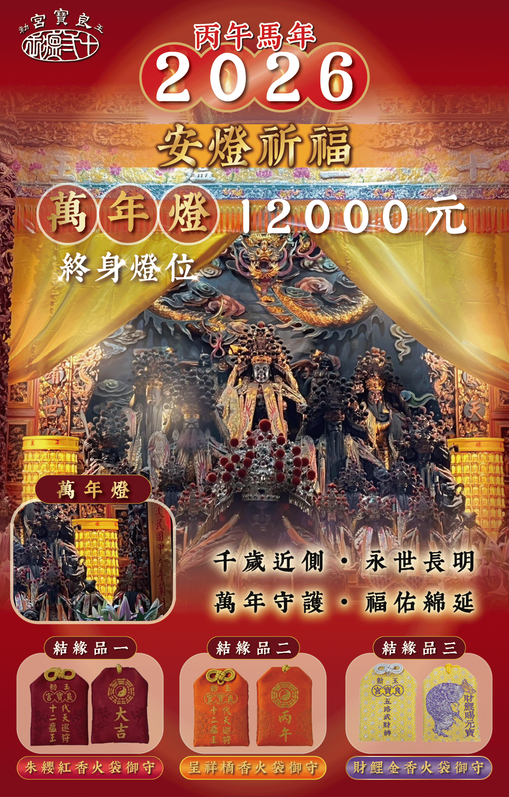 【萬年燈】結緣金 12000元 終身護佑.神威側立.限量 360 盞.席位珍稀玉勅良寶宮「萬年燈」,最接近神威的守護萬年燈供奉於中殿神龕內,隨侍在 玉勅良寶宮《代天巡狩十二瘟王》 兩側。這是距離神明最近的位置,日夜接受千歲爺神威薰陶,恩澤長照不息。